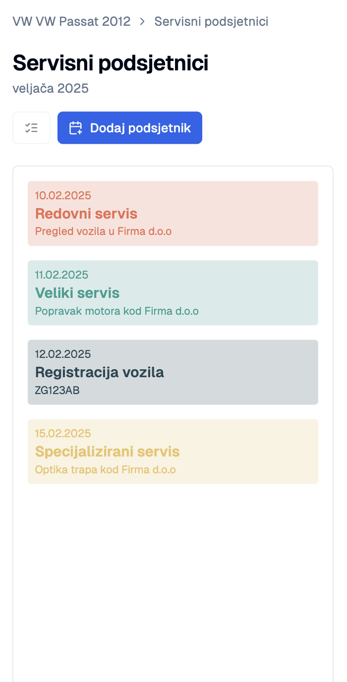 Digitalna evidencija svih vaših servisa - od redovnih pregleda do popravaka. Pratite povijest održavanja, primajte obavijesti za nadolazeće servise.